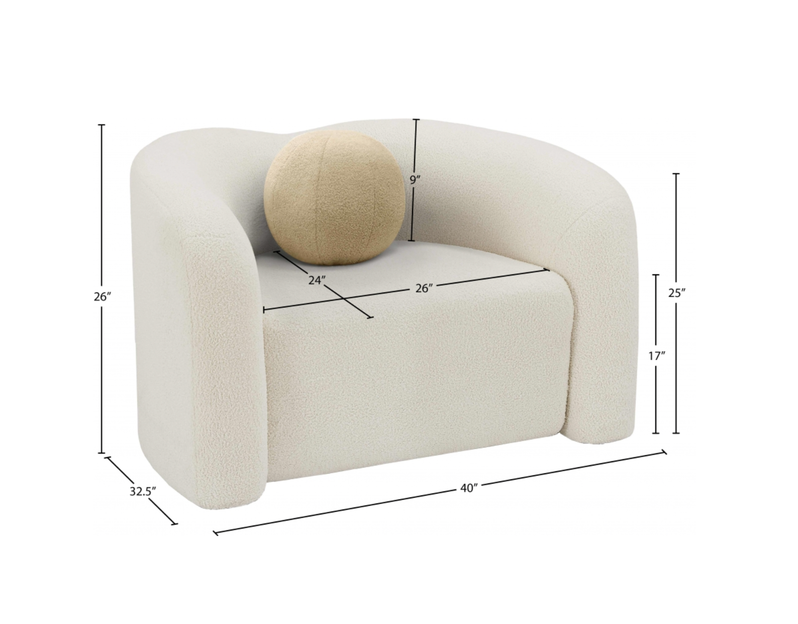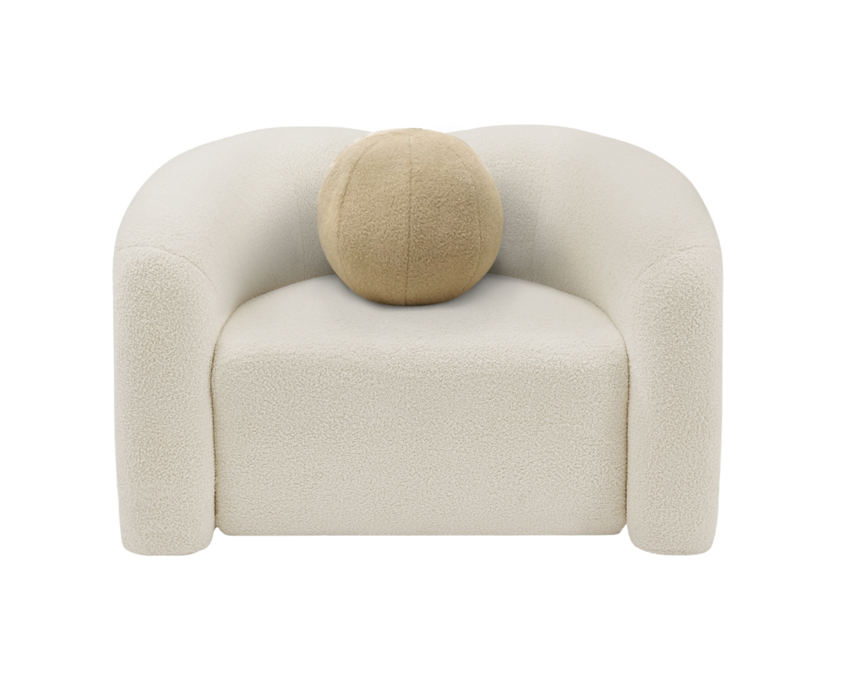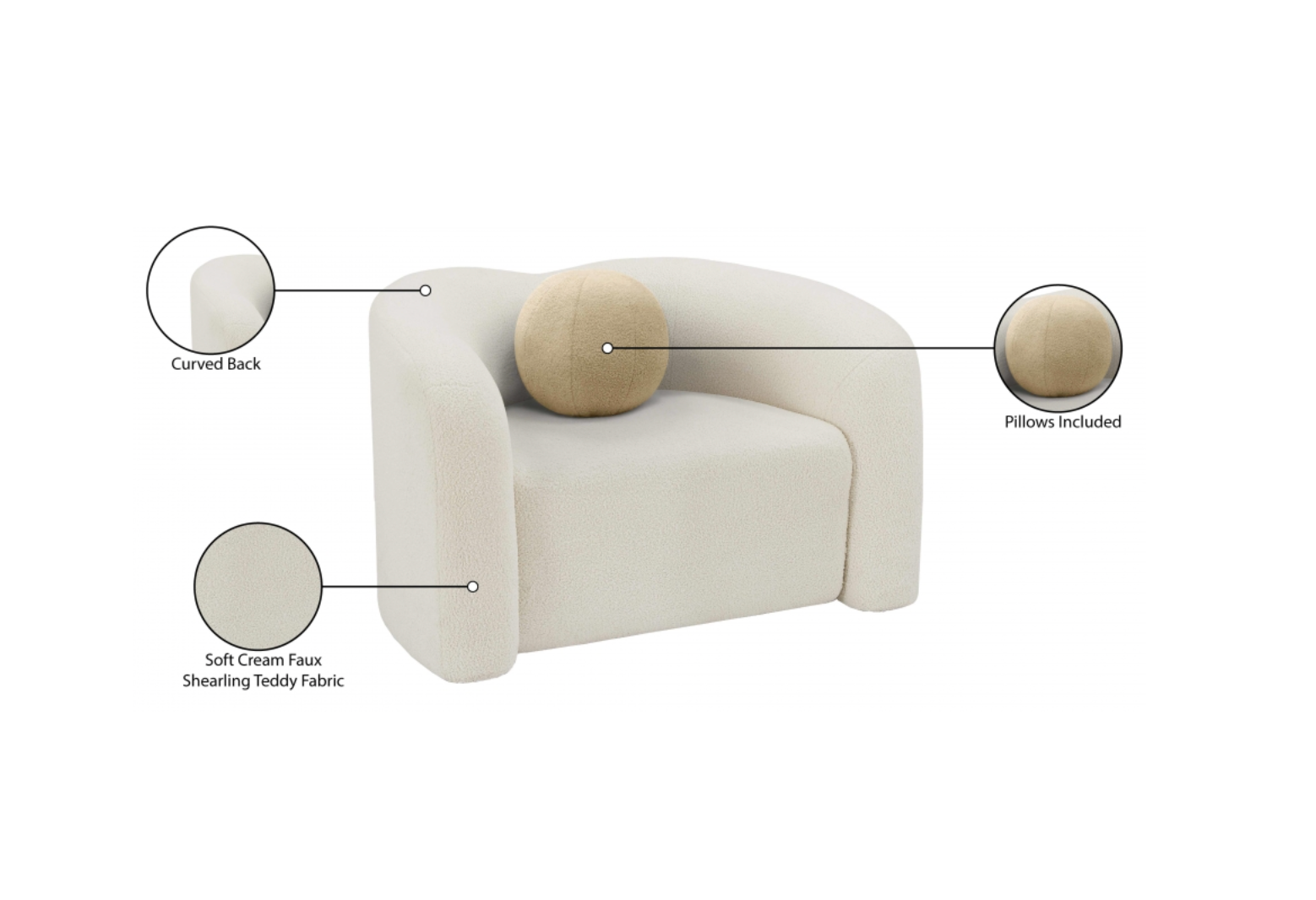 Sink into cozy comfort with the Aria Chair. Wrapped in ultra-soft cream teddy fabric, this accent chair features a curved back, plush pillows, and a sturdy eucalyptus wood frame — offering modern style and softness for any room in your home.