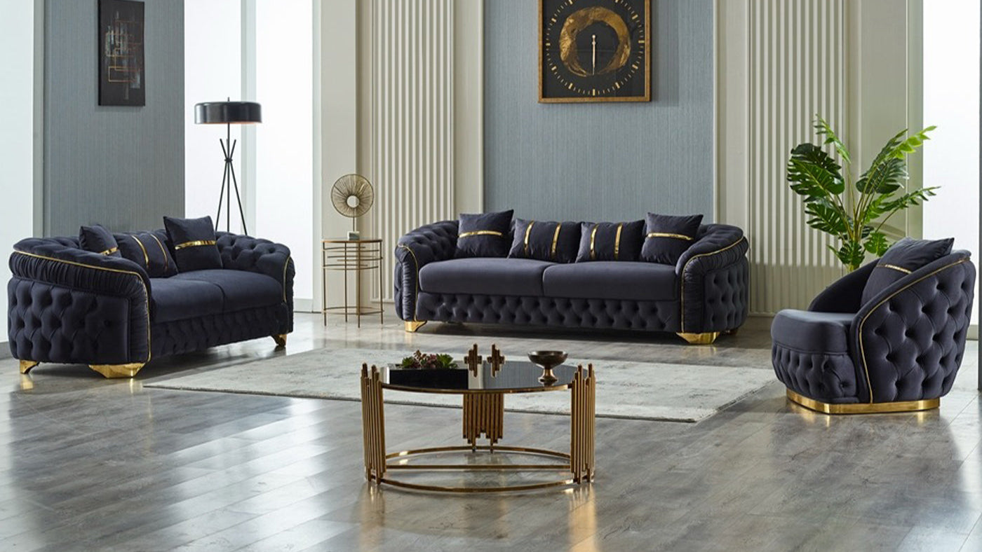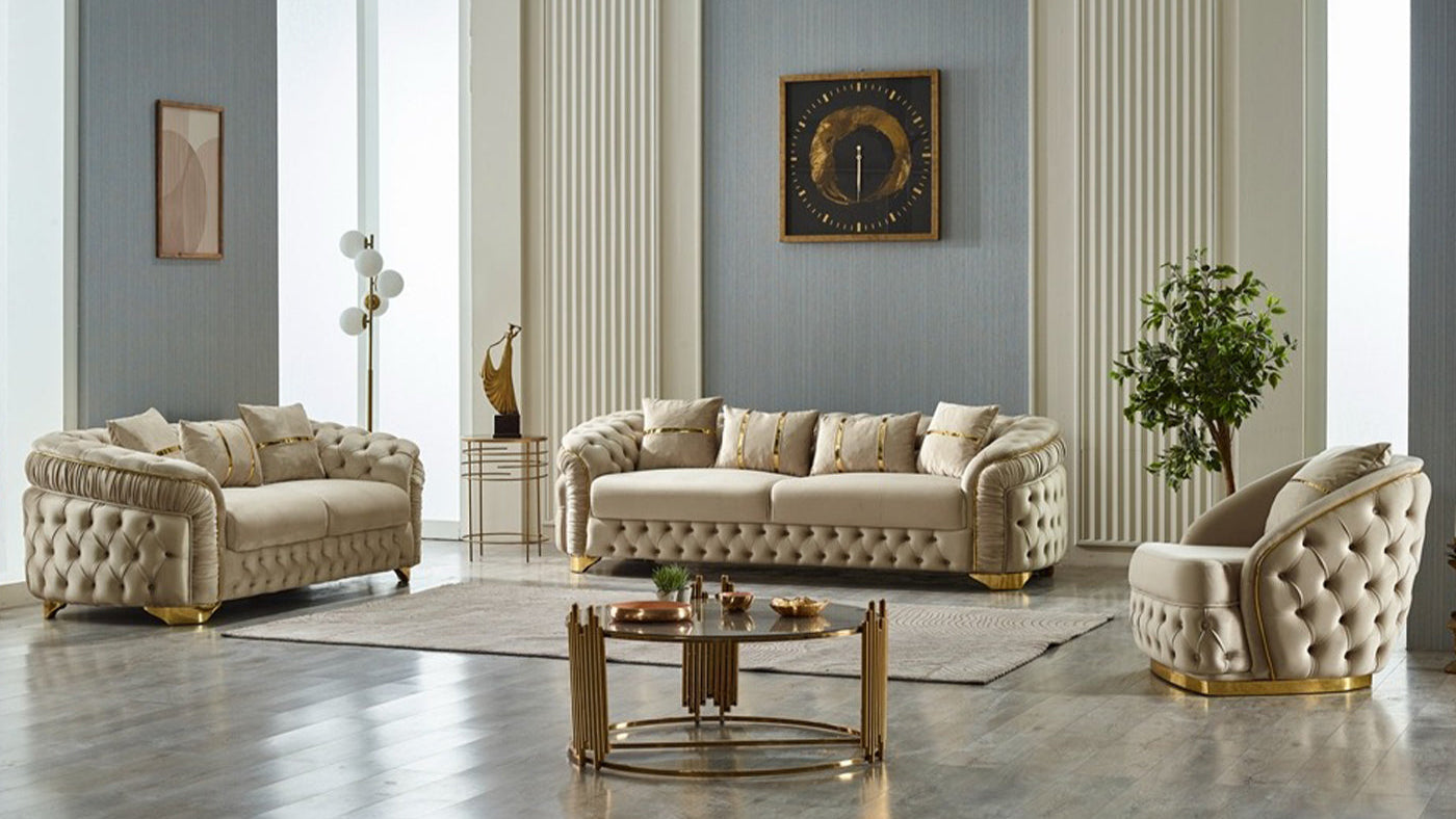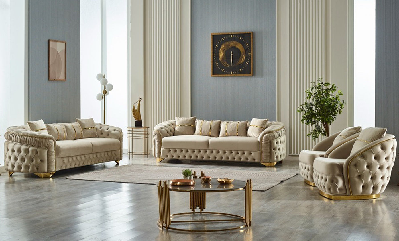 Arizona Sofa Set combines classic chester design with modern elements, offering a luxurious atmosphere with its gold metal legs and gold ribbon details. This sofa set aims to make your living spaces special by merging aesthetics and comfort.