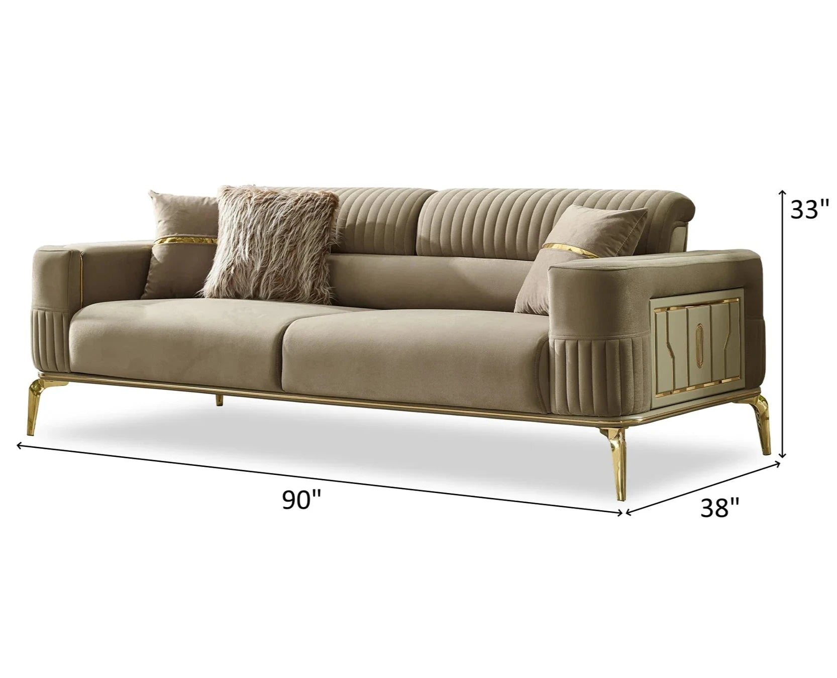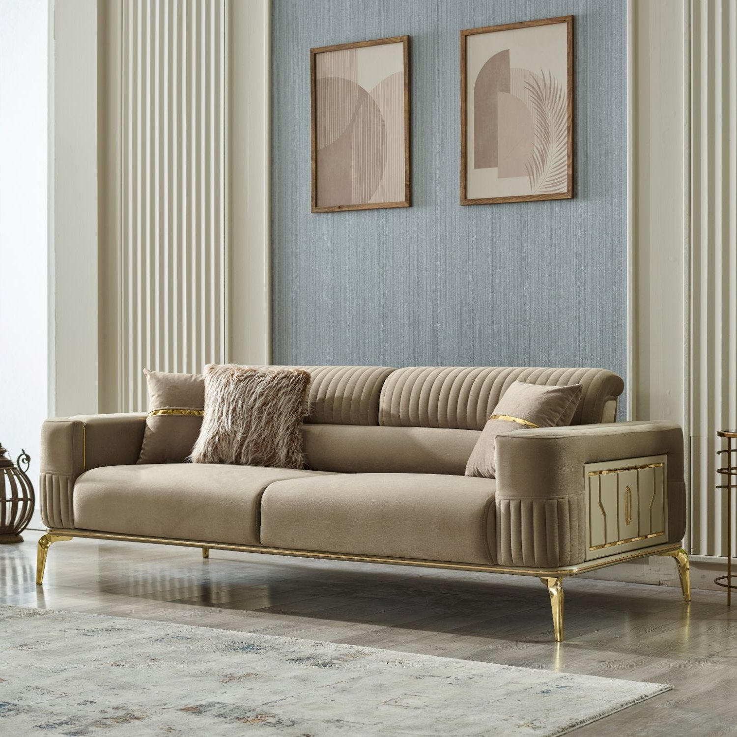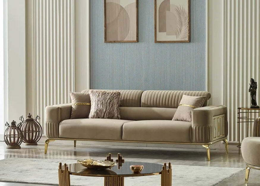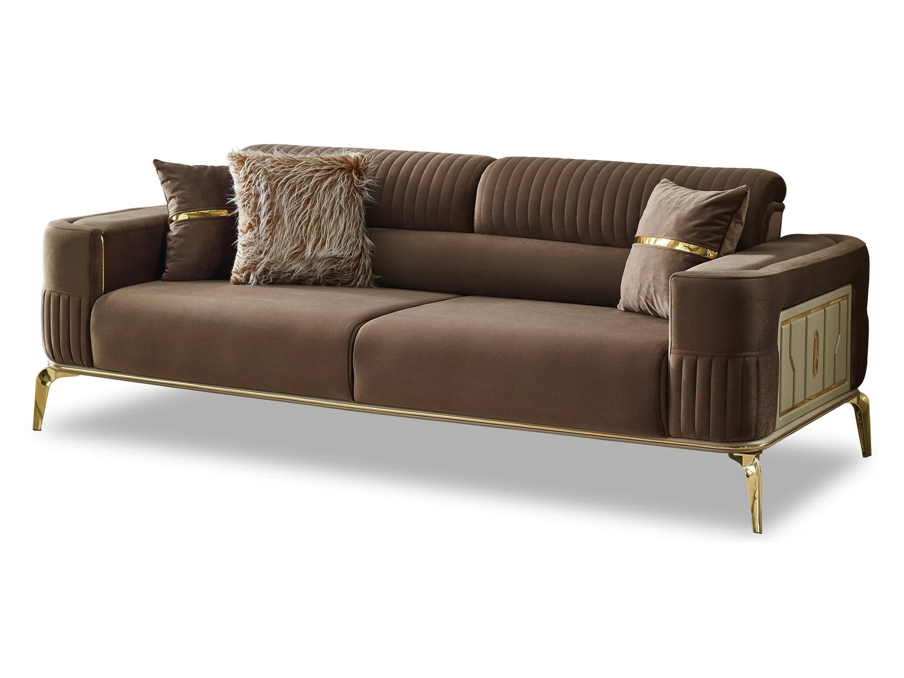 Armoni Sofa Set, as a pioneer of modern design, offers an extraordinary comfort experience. Enriched in both aesthetics and functionality, this special sofa set provides a dazzling sophistication with its ability to transform into a bed by turning its back, golden metal legs, and wooden details.
