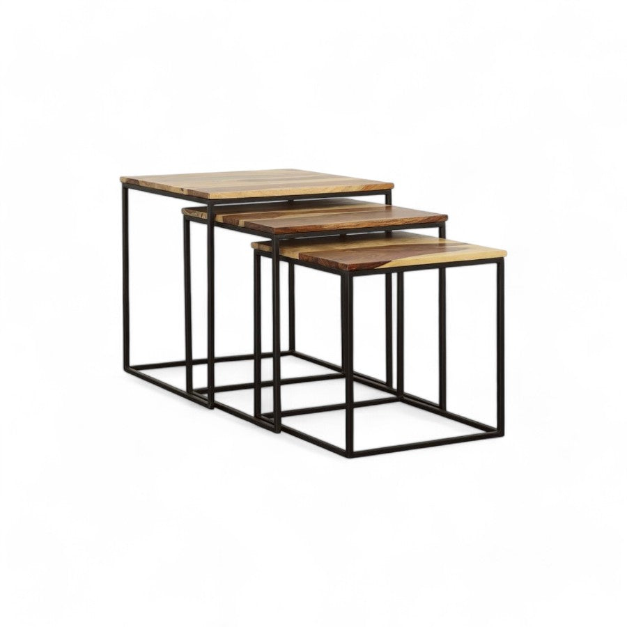 This simple set of three wood nesting tables adds convenience and style to your space. Rectangular tabletops showcase natural wood hues for added flair, while slim black metal legs provide support. Perfect for rustic or industrial decor, each table offers extra surface space for essentials and decor.