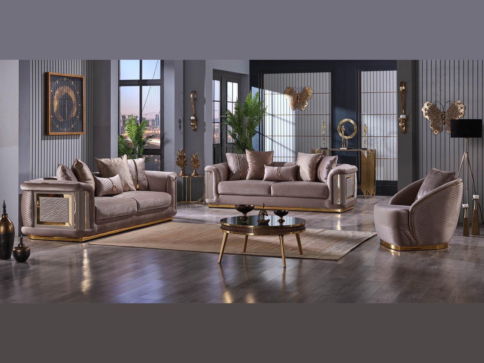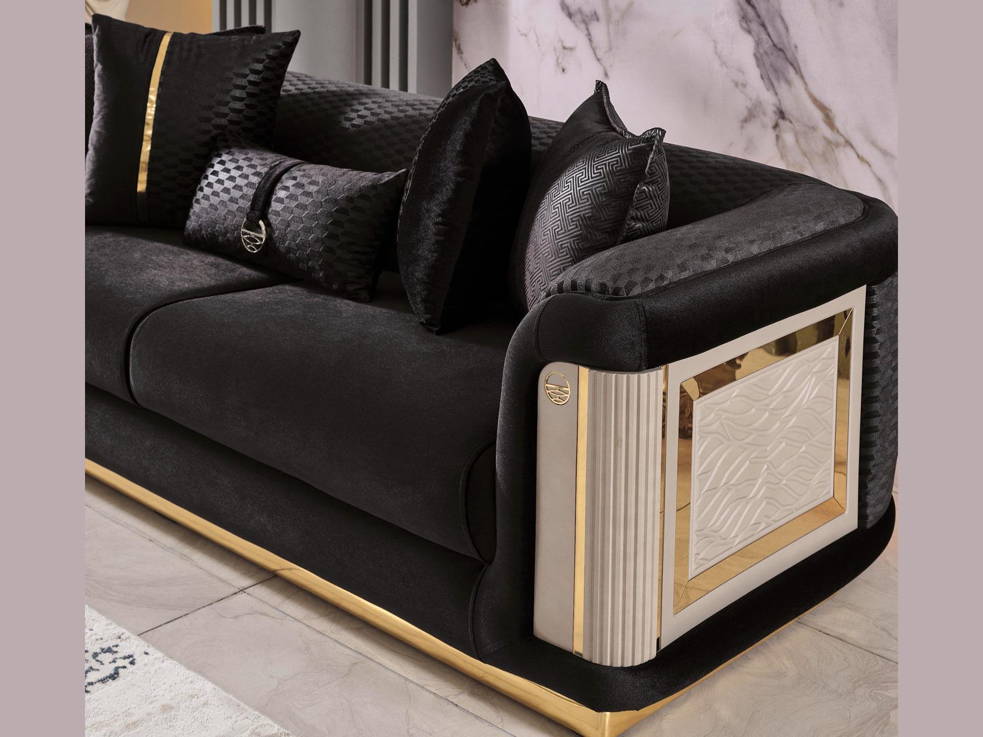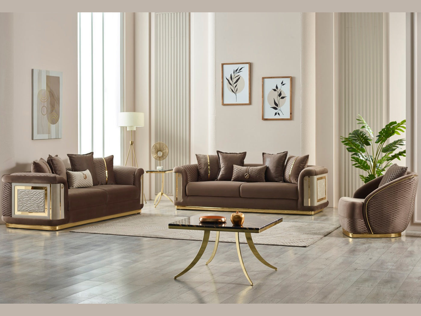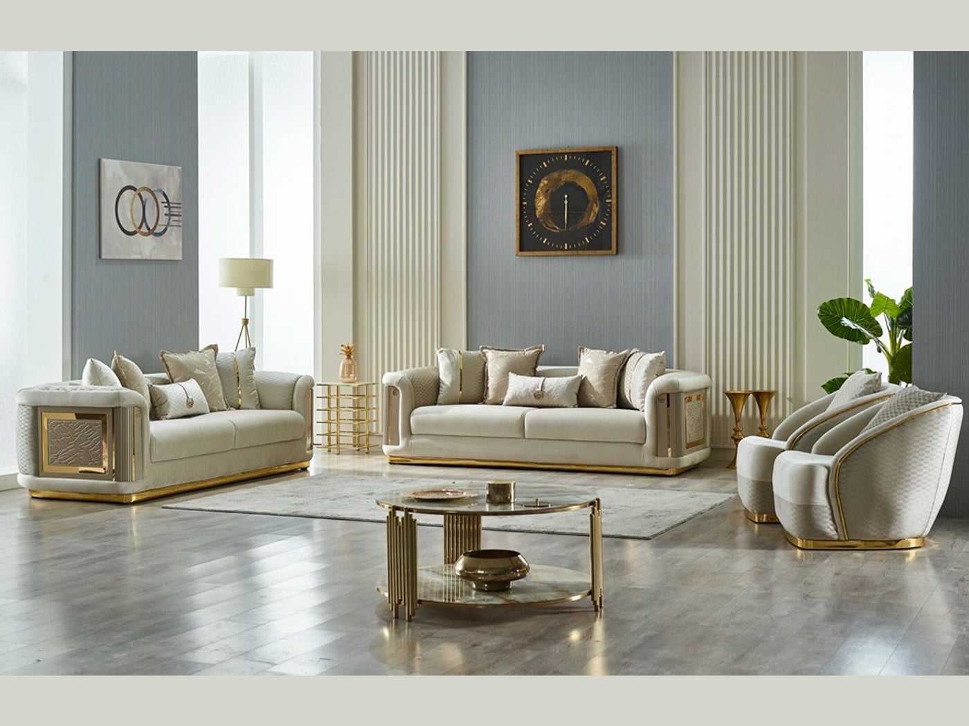 The Elegance Sofa Set represents a design where elegance and luxury converge through gold details. This sofa set, combining aesthetics and comfort, not only adds a personalized touch to your home but also offers a dazzling atmosphere.