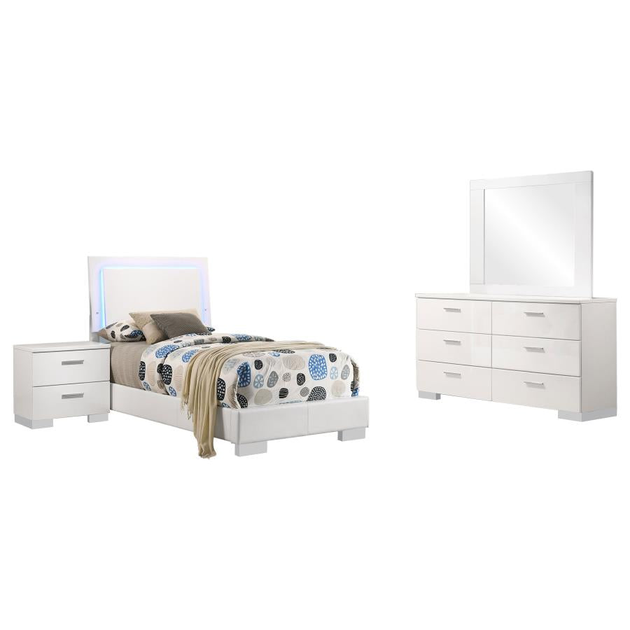 Sleek design meets ambient lighting in the Luminia Bedroom Set. Featuring a high-gloss white panel headboard with built-in blue LED lighting activated by a touch switch, this set brings a futuristic yet cozy vibe to your space. The bed is upholstered in soft white faux leather for added refinement, while matching storage pieces offer smooth metal glides and chrome-finished handles and feet for a polished finish.