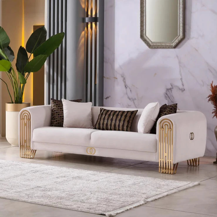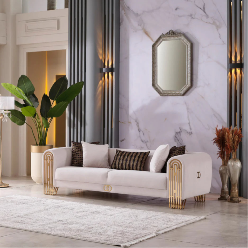 The Monaco sofa set elevates your home by merging aesthetic elegance and comfort. With its gold metal details, metal arm design, and quality materials, Monaco is designed to add value to your living space as a furniture set.