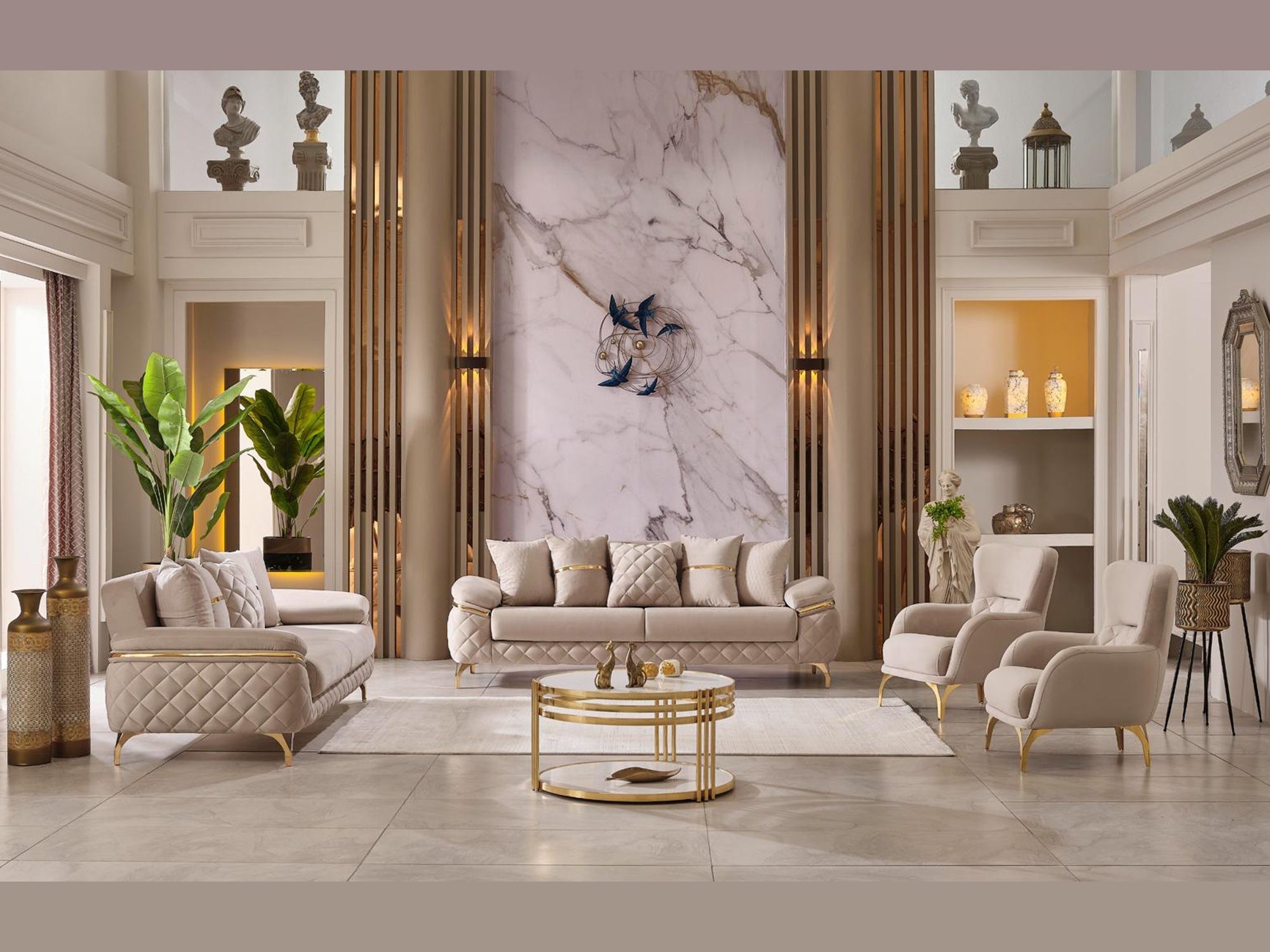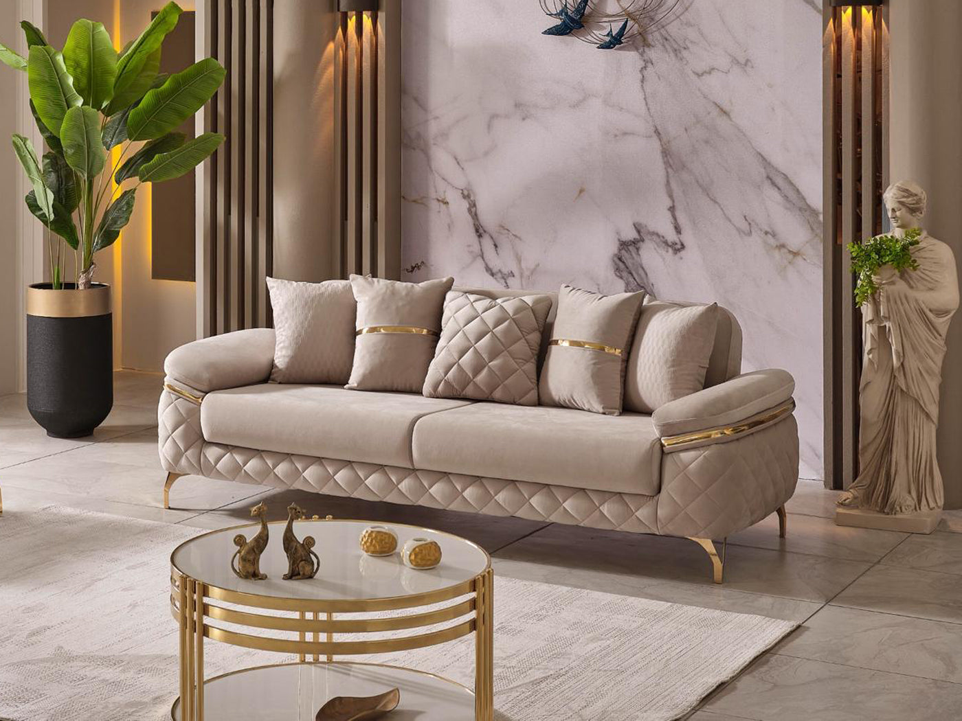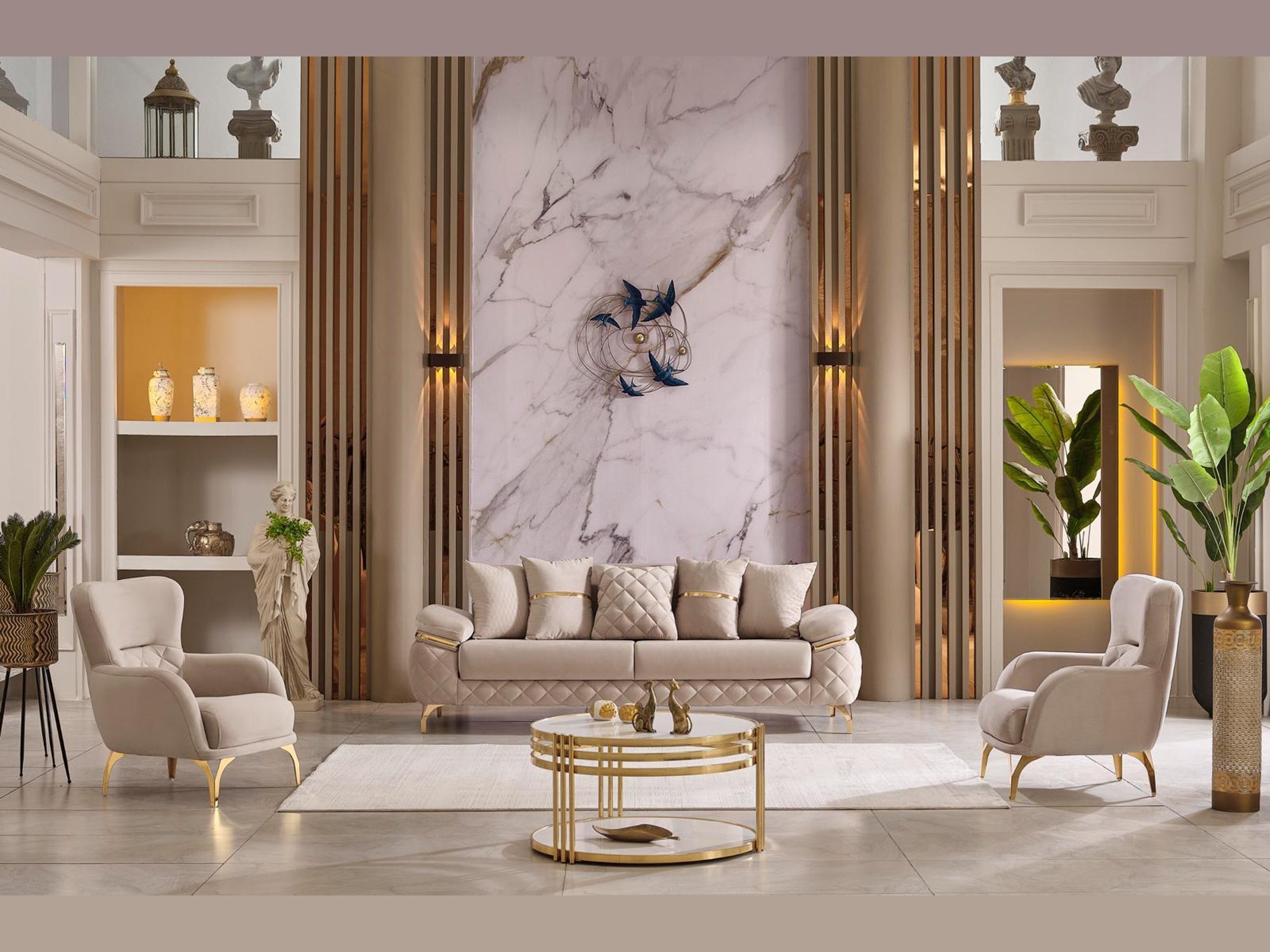 The specially designed metal base, highlighted by its eye-catching gold color, enhances the overall elegance. Gold accents on the arm details further emphasize its sophistication. The stitched fabric structure on the armrests not only provides an aesthetic look but also ensures durability; these details contribute to the refined character of the sofa set.