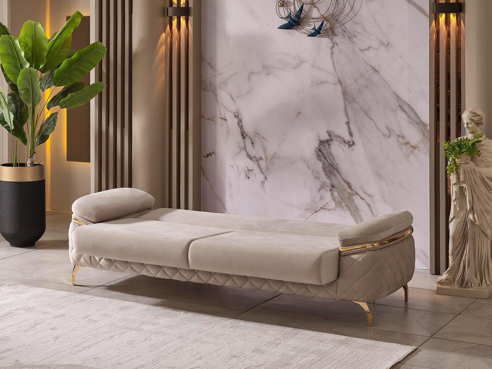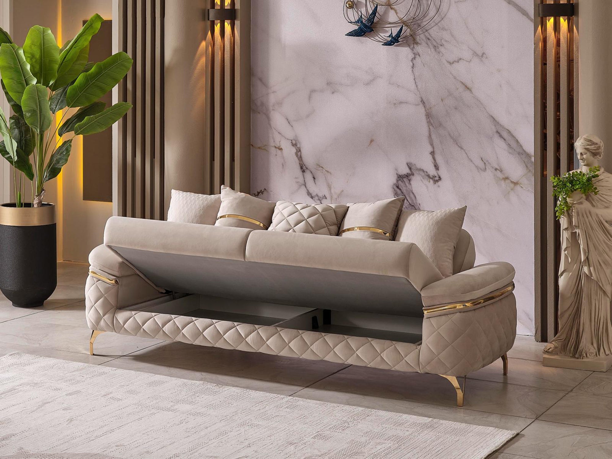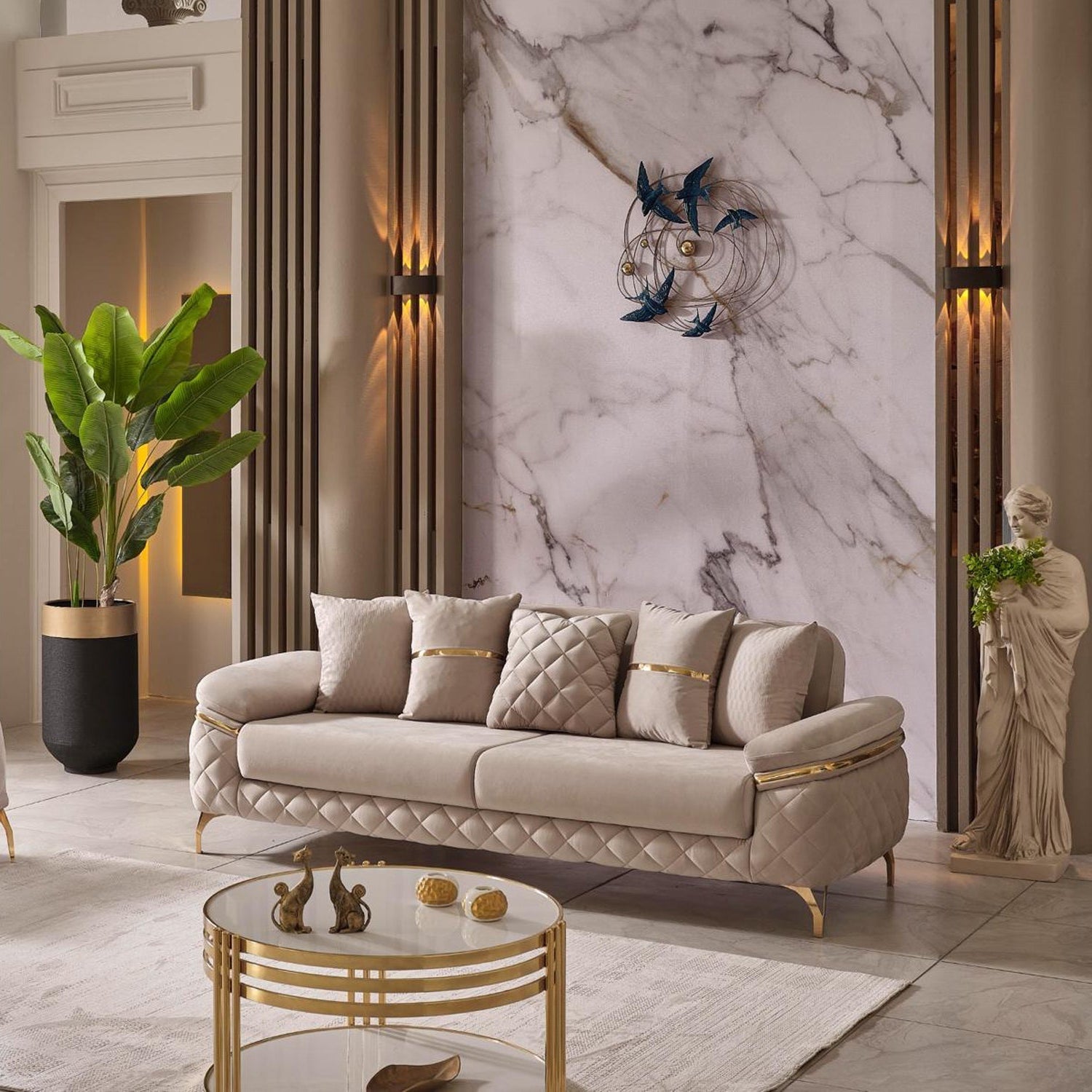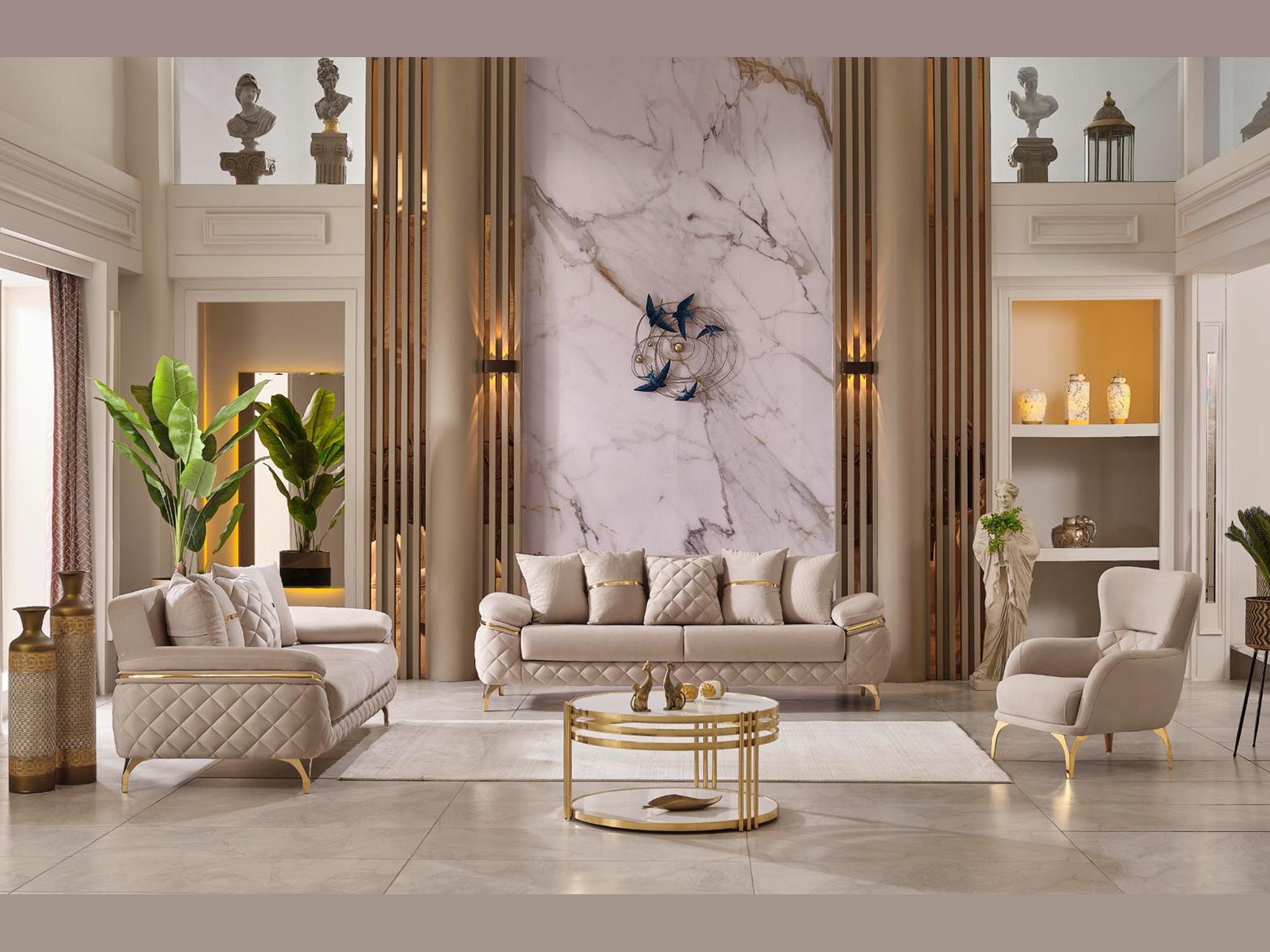 The specially designed metal base, highlighted by its eye-catching gold color, enhances the overall elegance. Gold accents on the arm details further emphasize its sophistication. The stitched fabric structure on the armrests not only provides an aesthetic look but also ensures durability; these details contribute to the refined character of the sofa set.
