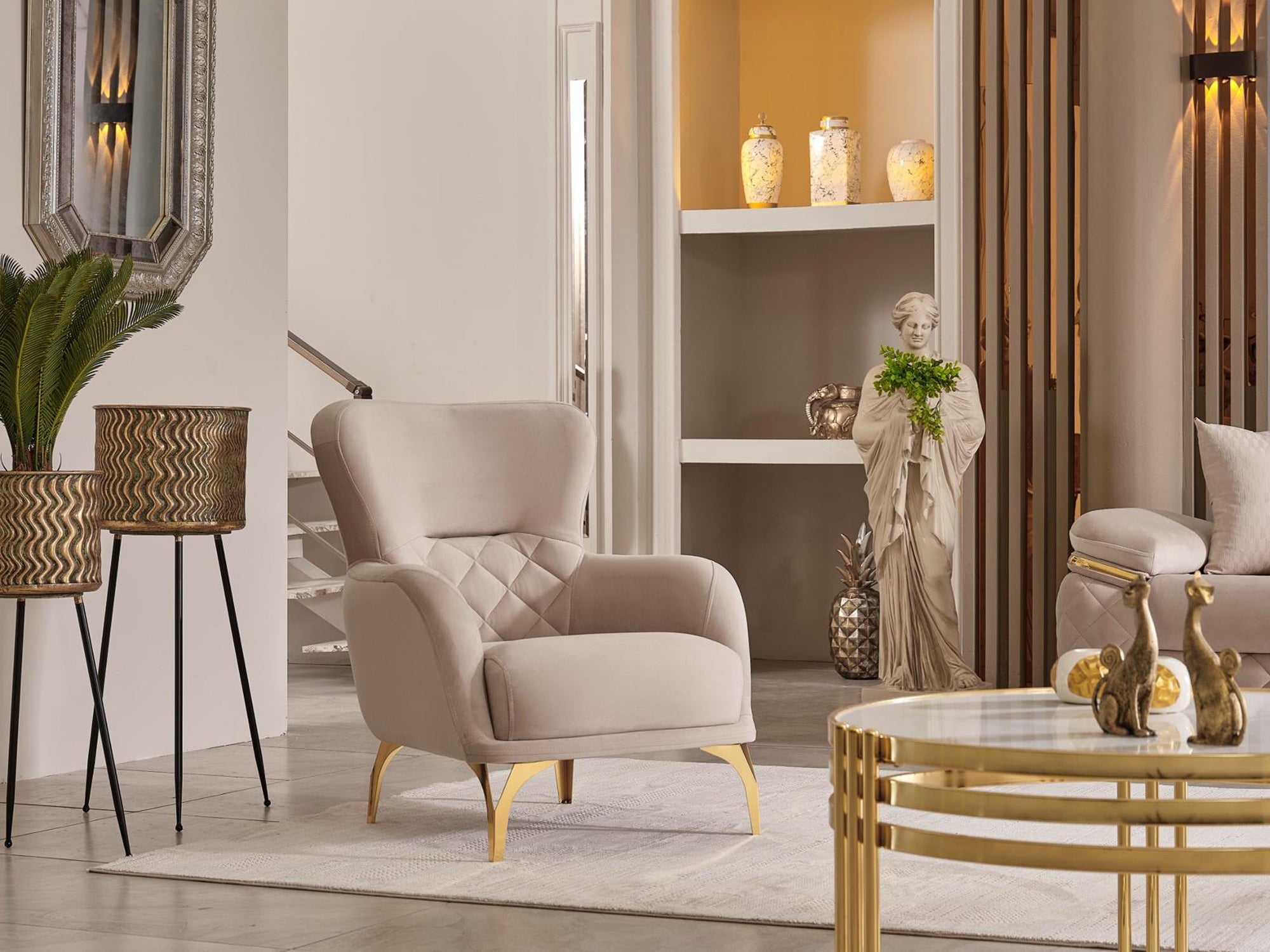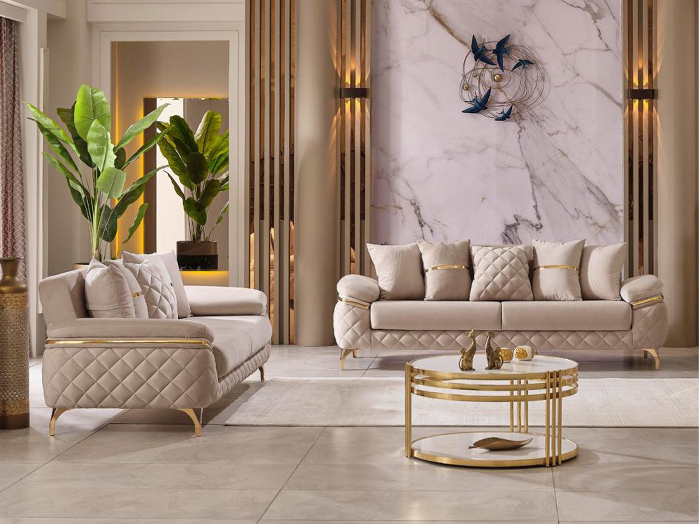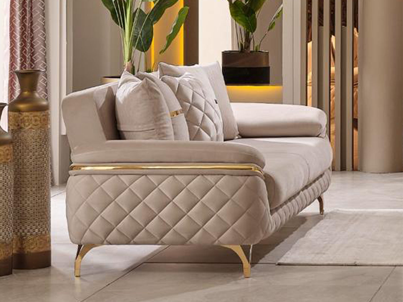 The specially designed metal base, highlighted by its eye-catching gold color, enhances the overall elegance. Gold accents on the arm details further emphasize its sophistication. The stitched fabric structure on the armrests not only provides an aesthetic look but also ensures durability; these details contribute to the refined character of the sofa set.