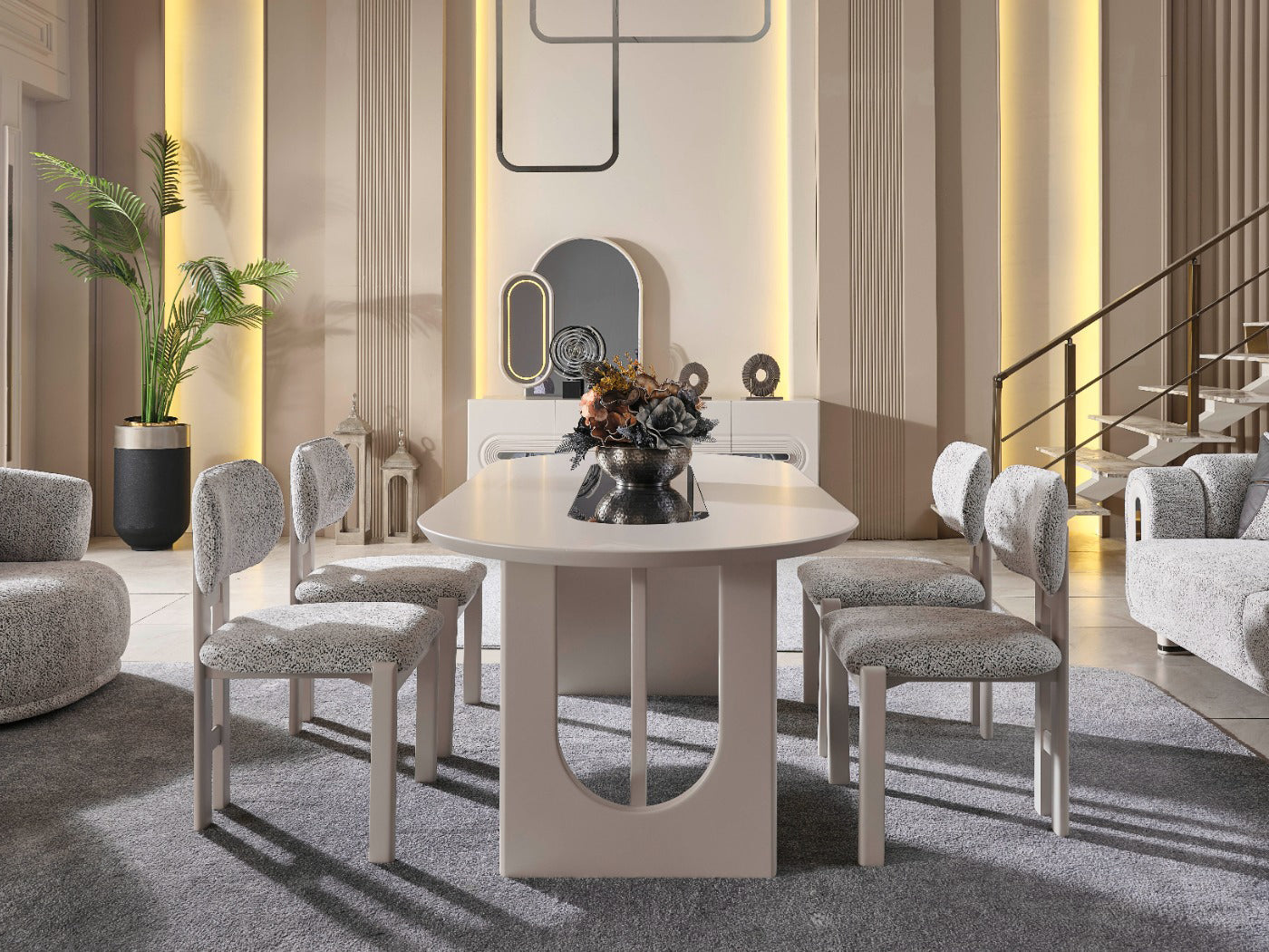 The Parma Dining Room Set stands out with its comfortable seating and refined design. Featuring soft-textured upholstery and sleek modern lines, it offers a pleasant dining experience while adding a sophisticated, prestigious touch to your space.