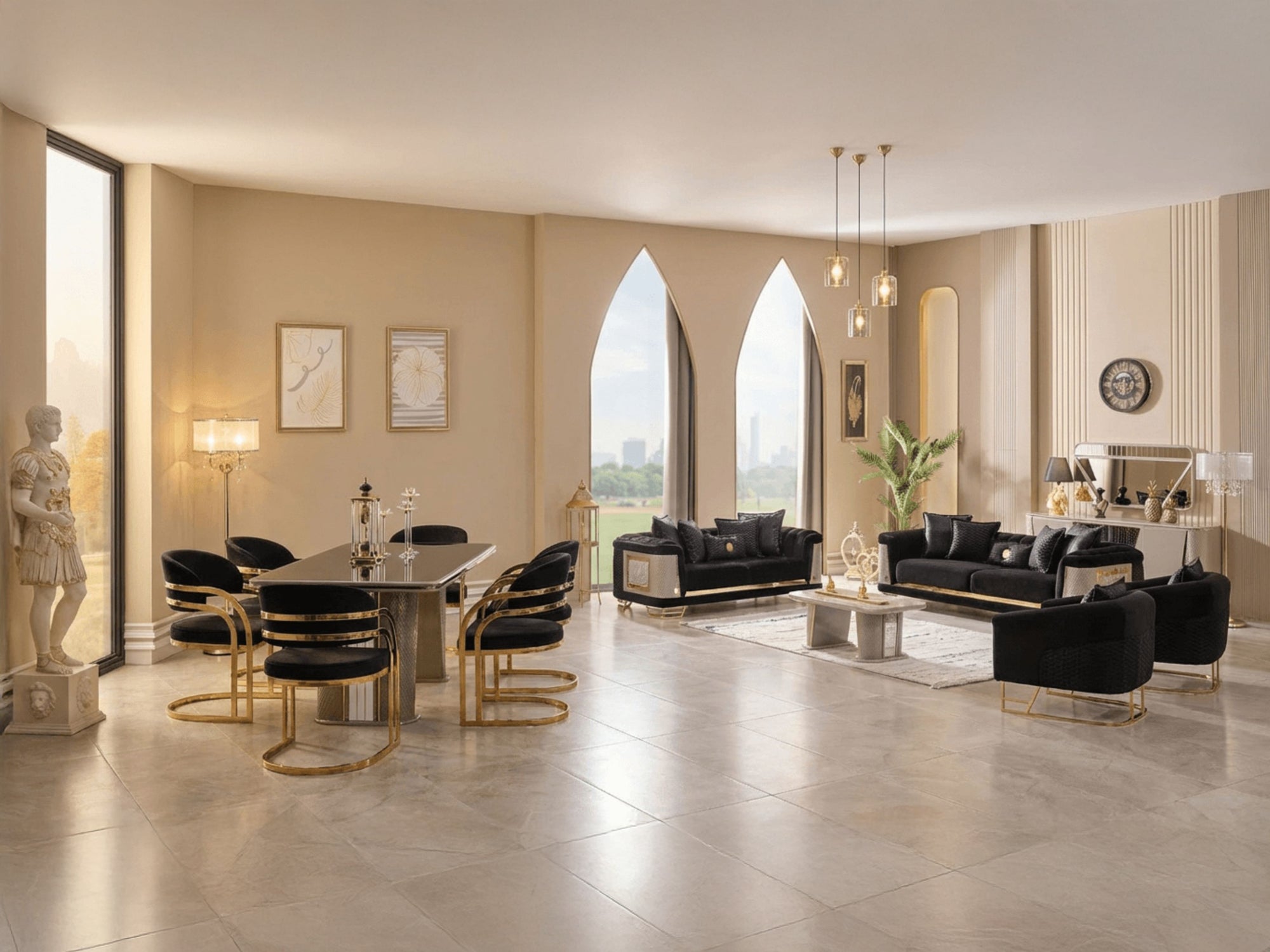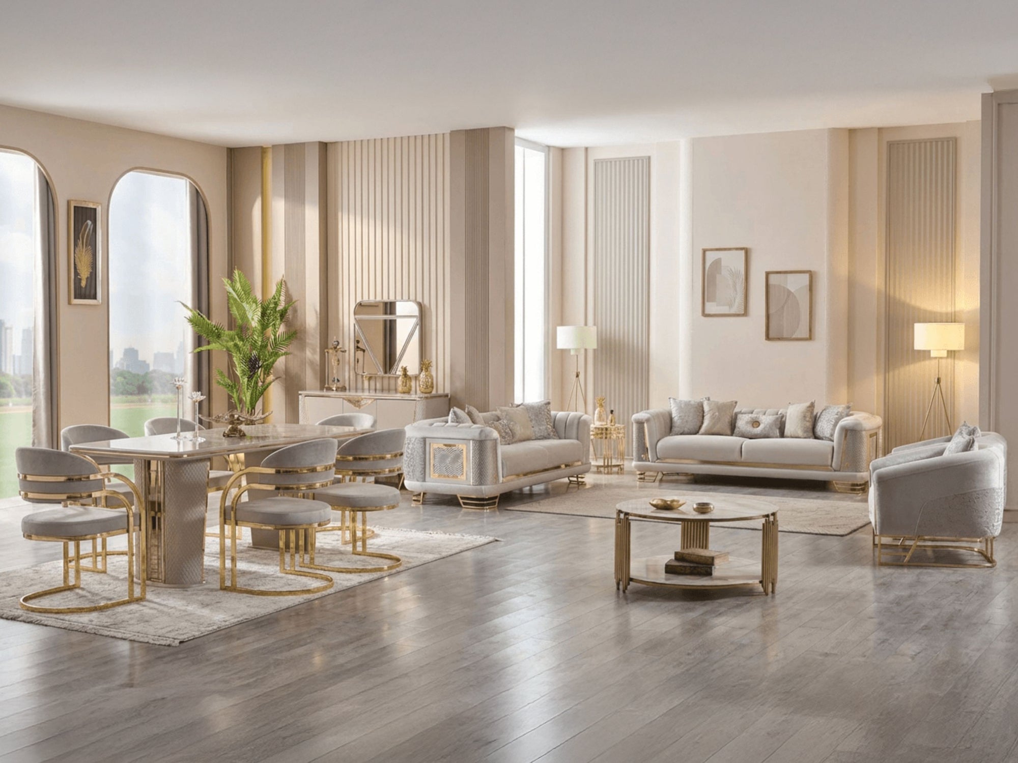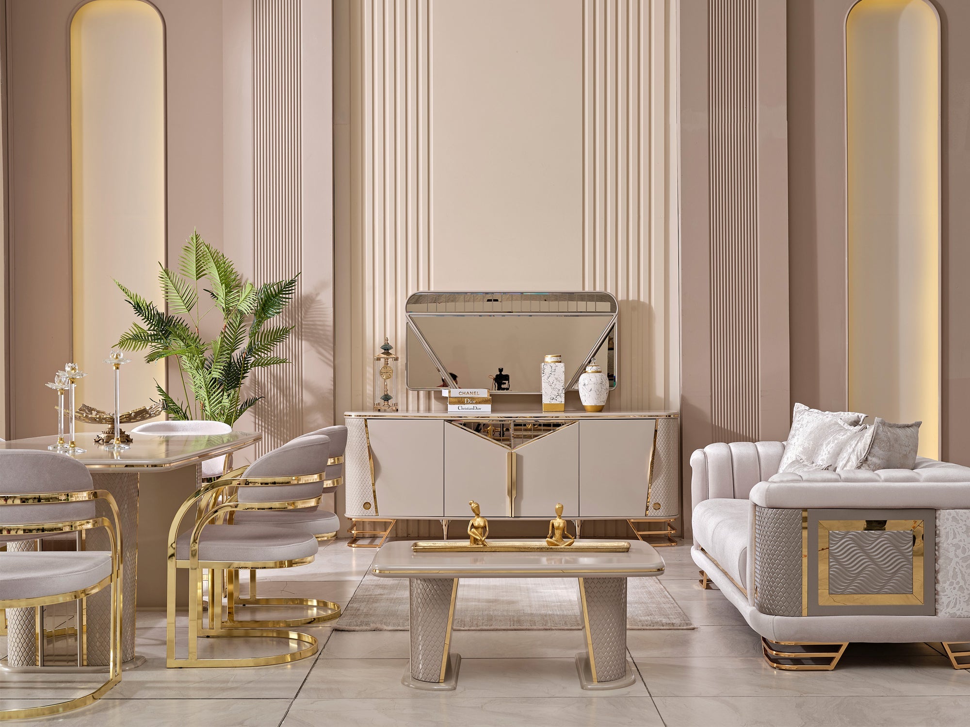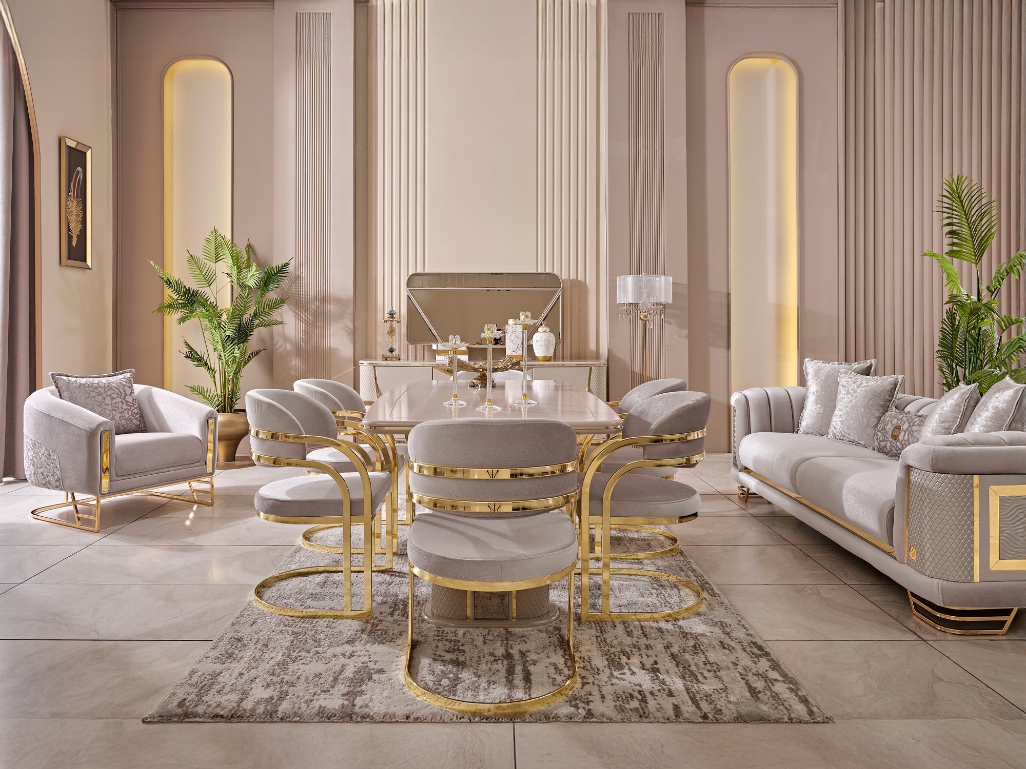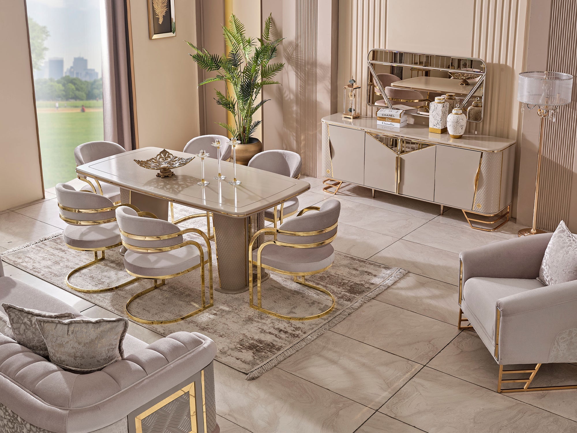 Where modern lines meet classic detailing, the Romans Dining Room Set brings timeless elegance to your space. Carefully crafted details, subtle gold accents, and a refined silhouette create a luxurious look that blends classic sophistication with modern simplicity.