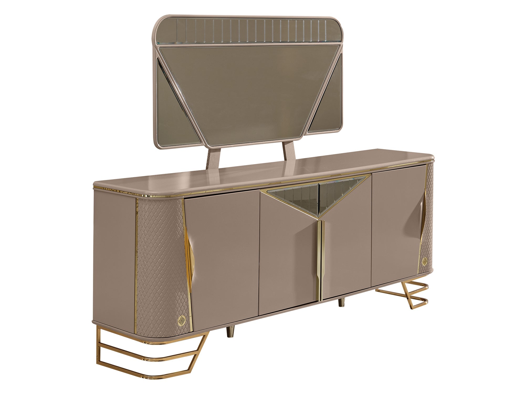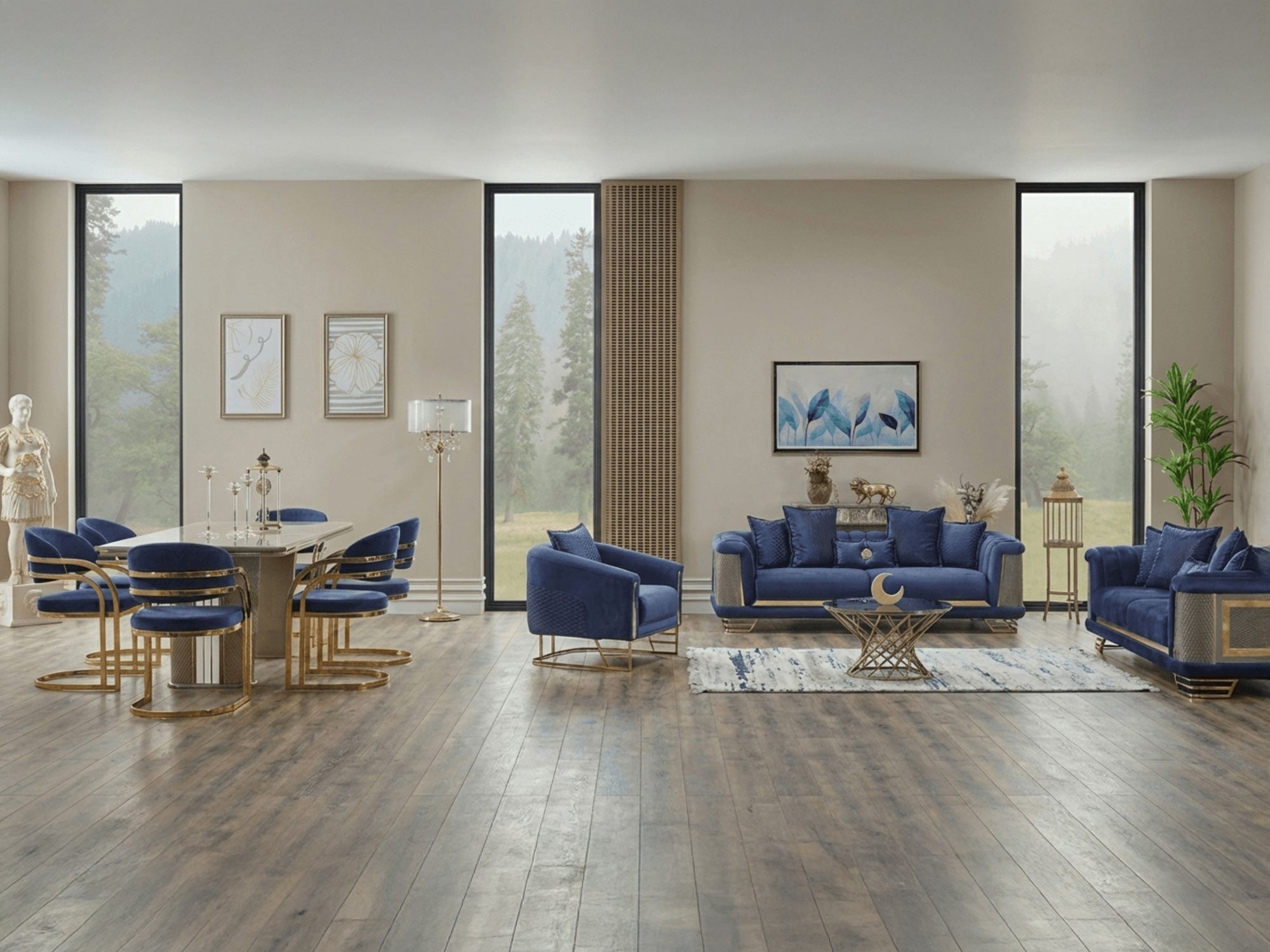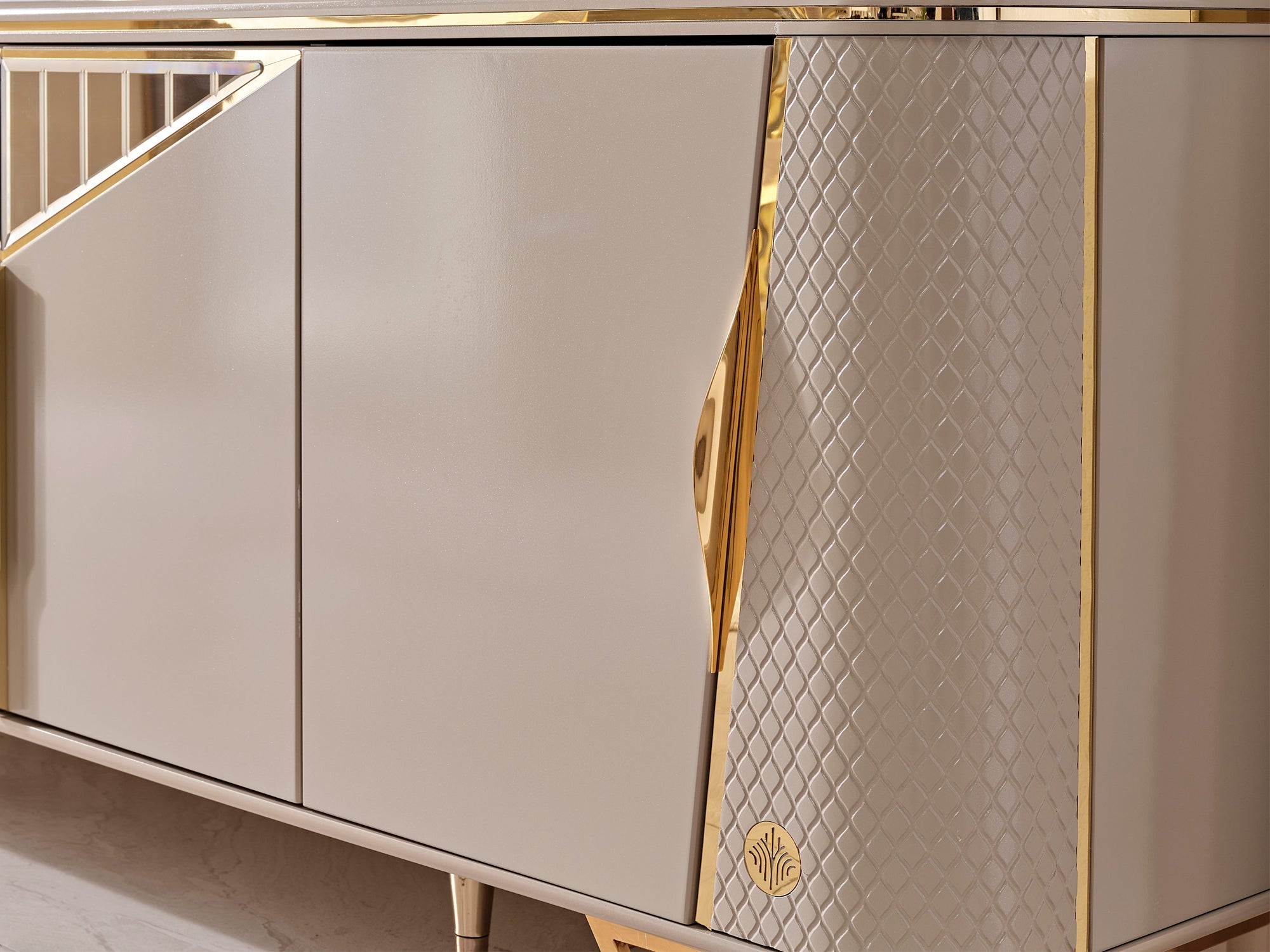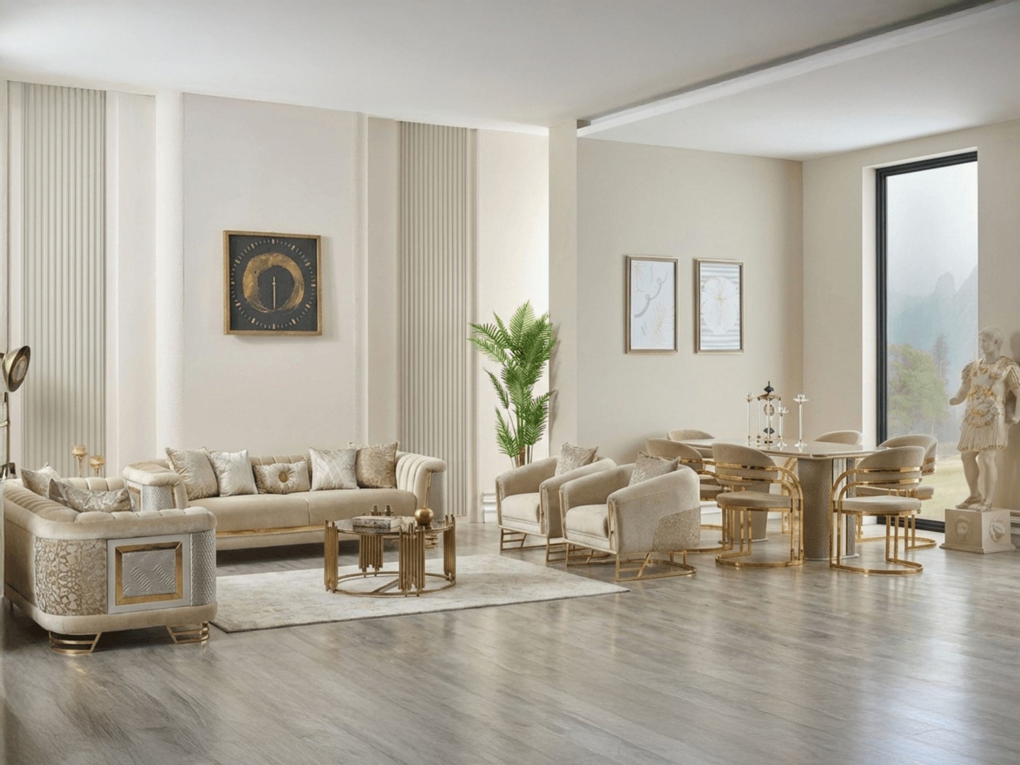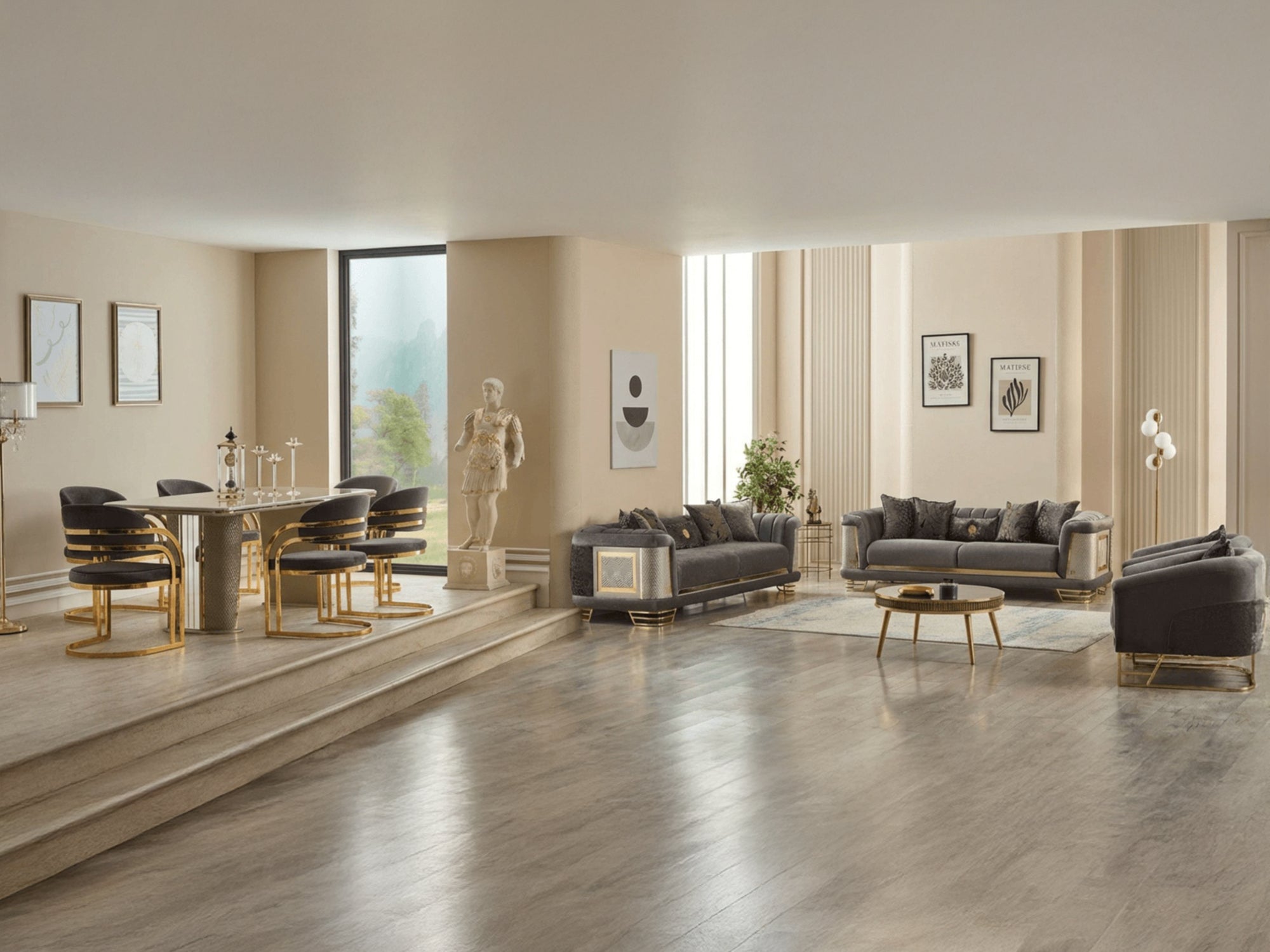 Where modern lines meet classic detailing, the Romans Dining Room Set brings timeless elegance to your space. Carefully crafted details, subtle gold accents, and a refined silhouette create a luxurious look that blends classic sophistication with modern simplicity.